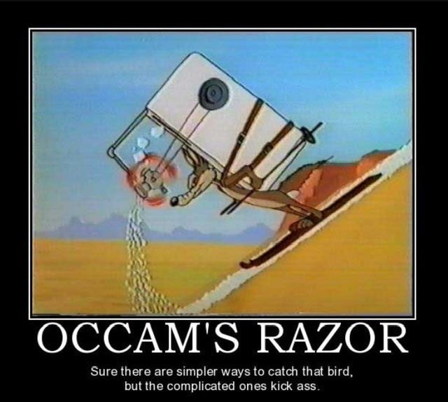 But Occam’s Razor can also be forward looking. Let’s say you have a problem to solve and an array of options to solve it, from simple to complex. Assuming all are equally good at solving your problem the best option is the simplest. Now of course, not every option will be equally good at solving your problem, so you may have to pick the second or third simplest option, but again the idea is that it is generally better to use the simplest option you can to solve your problem. For one thing, it is easier to implement, but also it is less likely to have unexpected or unwanted side effects.